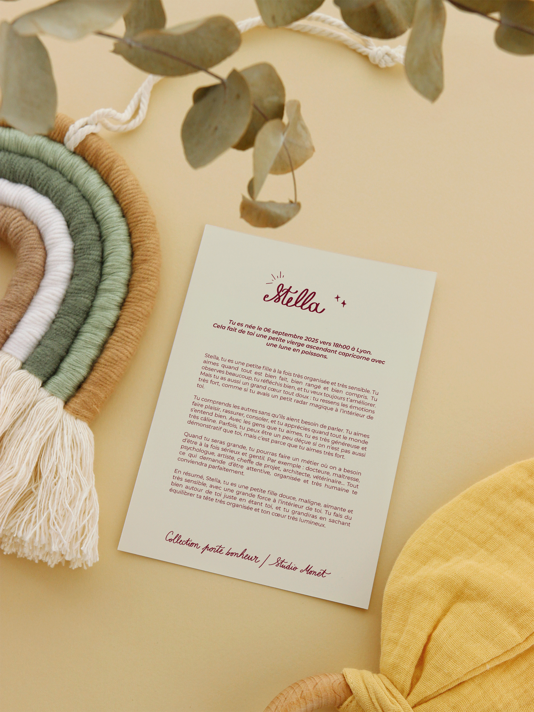 Si vous choisissez l’option thème astral, un texte astrologique doux, poétique et intime est imprimé au dos de l’affiche (signe solaire, ascendant, lune et grandes énergies).