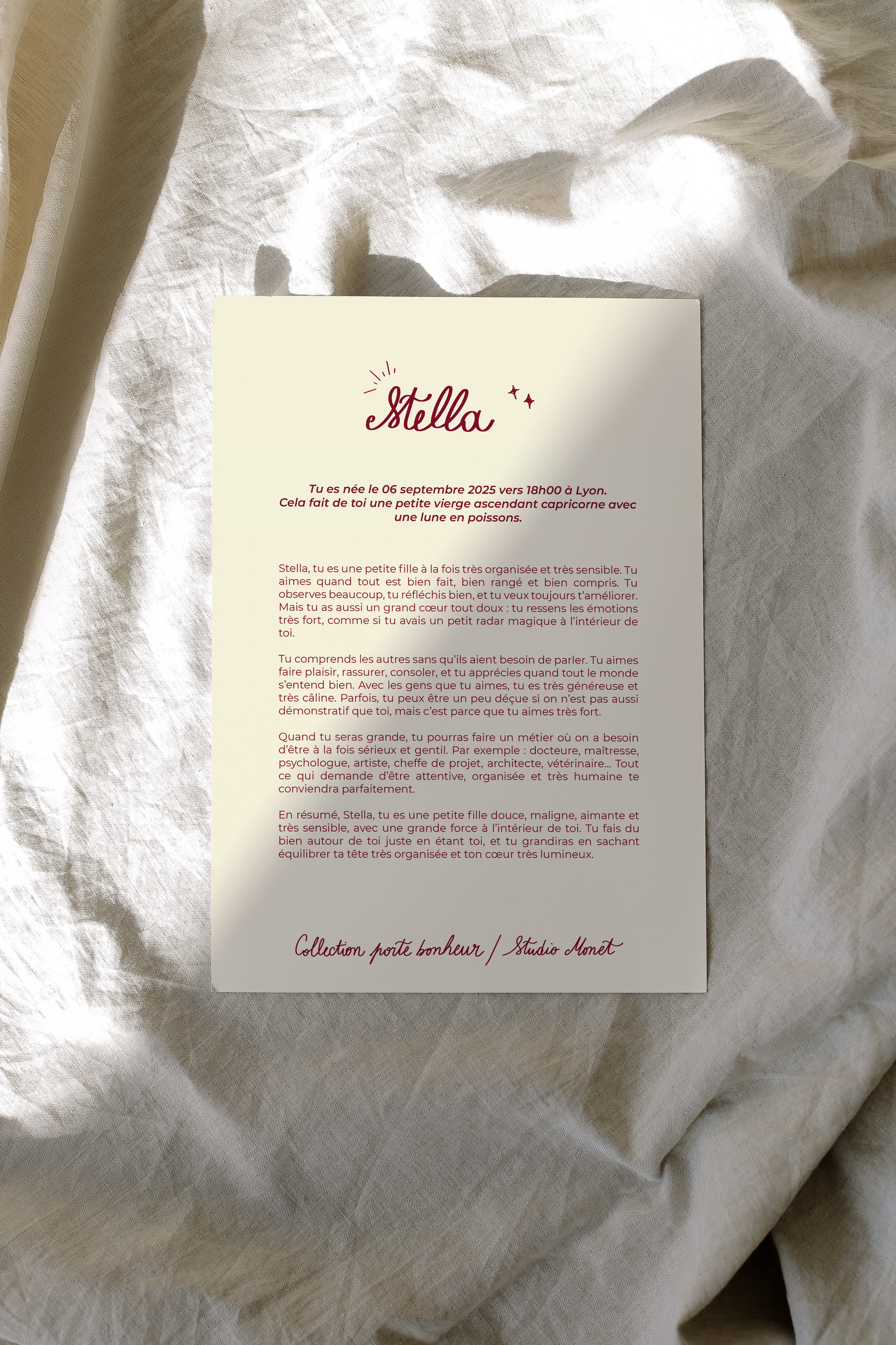 Si vous choisissez l’option thème astral, un texte astrologique doux, poétique et intime est imprimé au dos de l’affiche (signe solaire, ascendant, lune et grandes énergies).